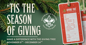 ‘Tis the Season for Giving – make a difference with the Giving Tree. Drop by the Scout Shop Giving Tree to give the gift of Scouting this holiday season, November 8th – December 14th.